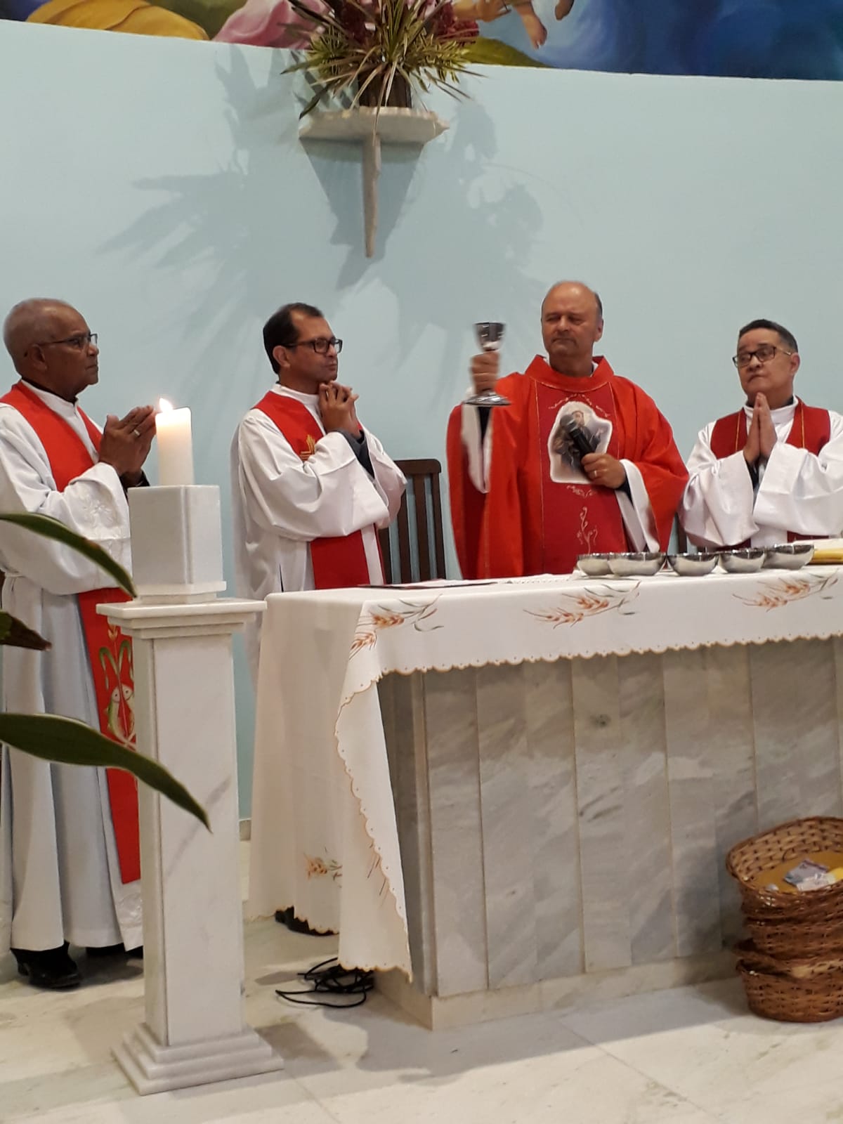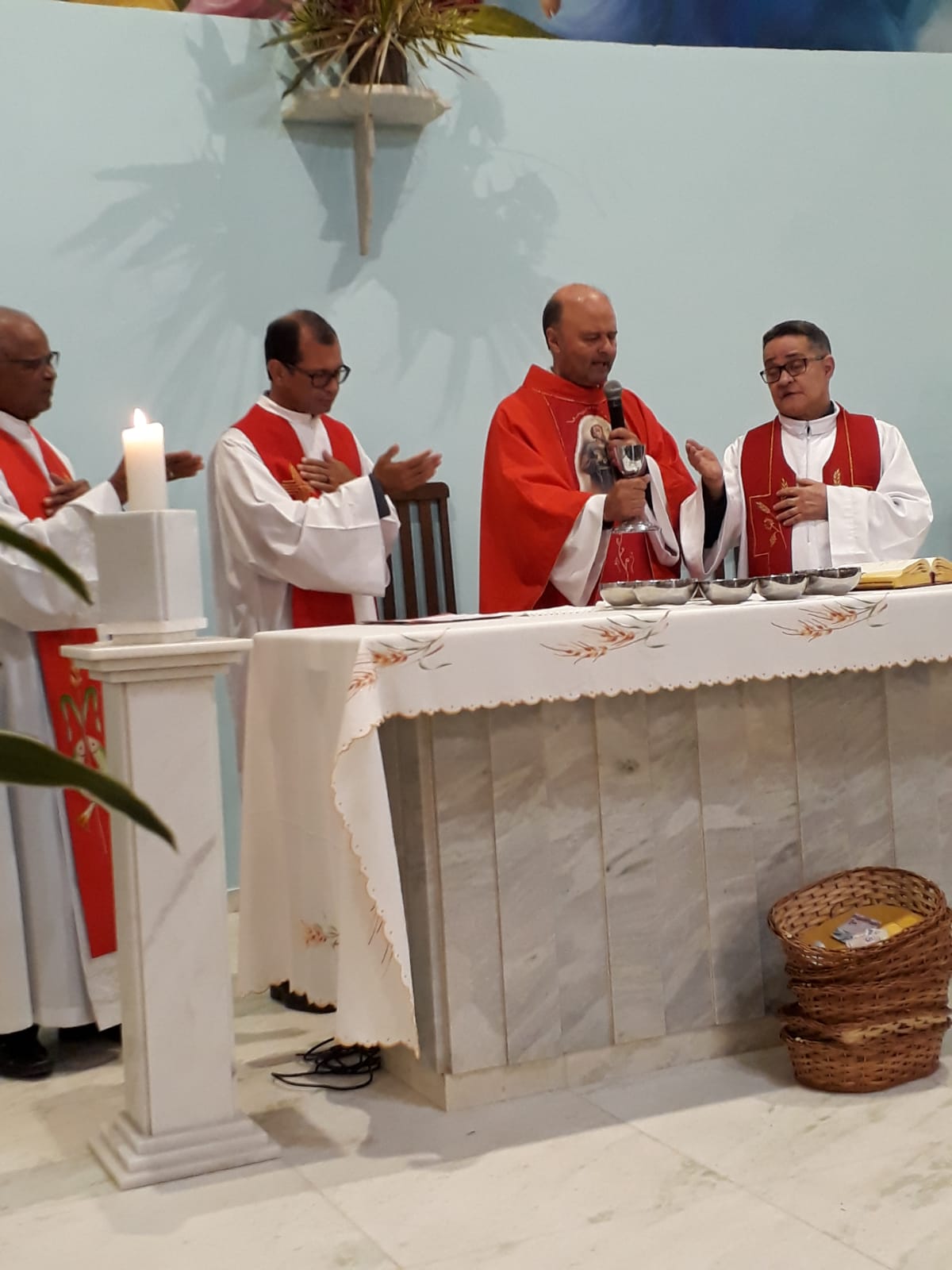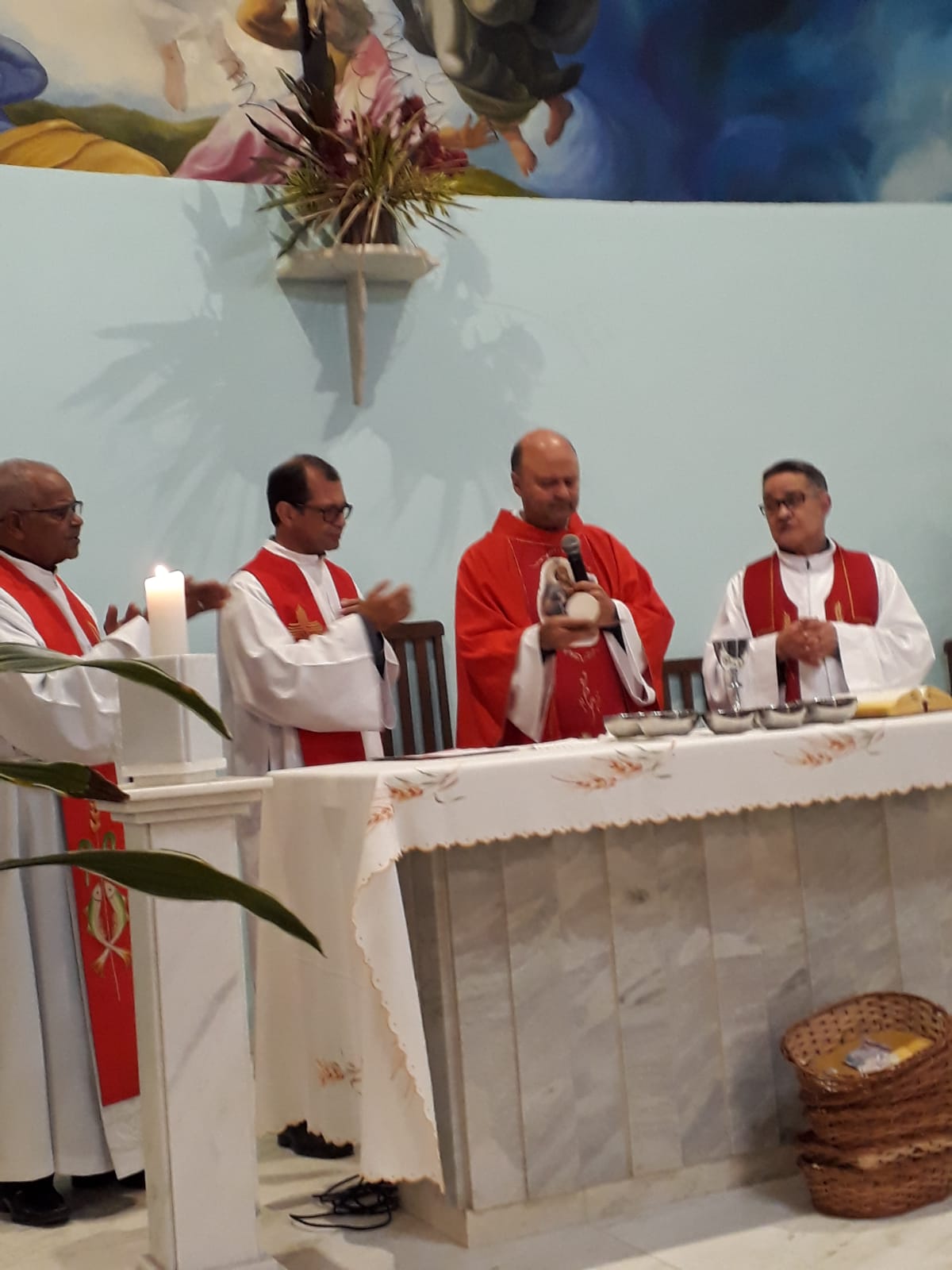 Quantos Padroeiros vieram hoje para fazer companhia à São Pedro! Sejam bem vindos: Santo Antônio, Nossa Senhora Aparecida, Nossa Senhora da Conceição, São Sebastião e Nossa Senhora das Graças! Ao receber os padroeiros e as comunidades, Pe. Paixão foi um anfitrião perfeito, fraterno e acolhedor: “Sintam-se em casa, a casa é de vocês”, disse ele.